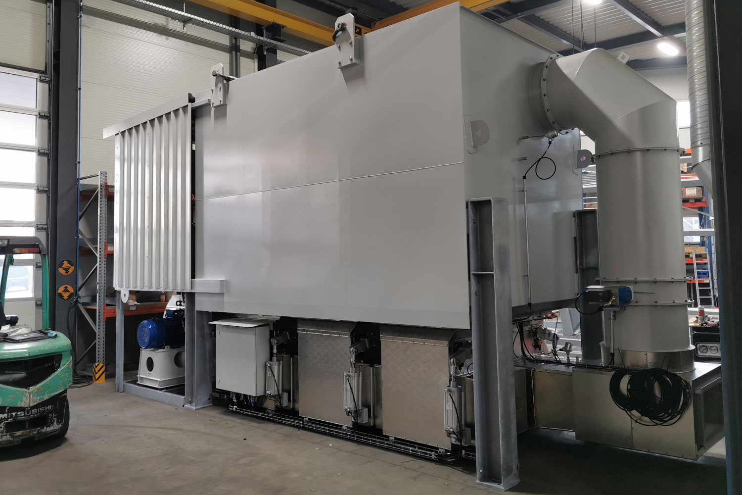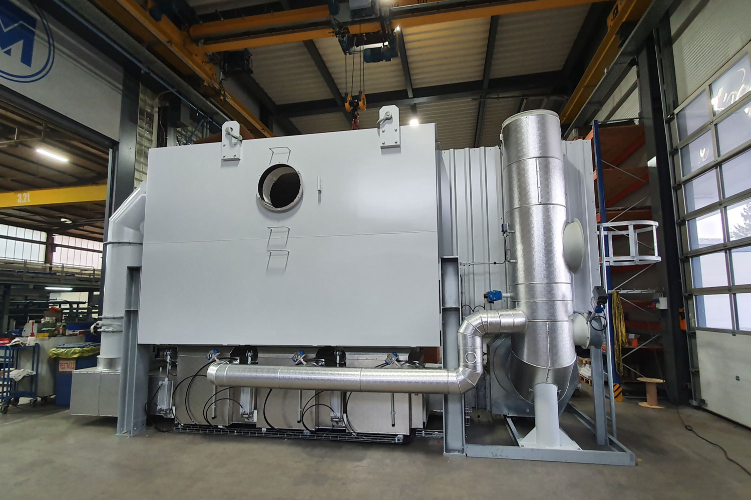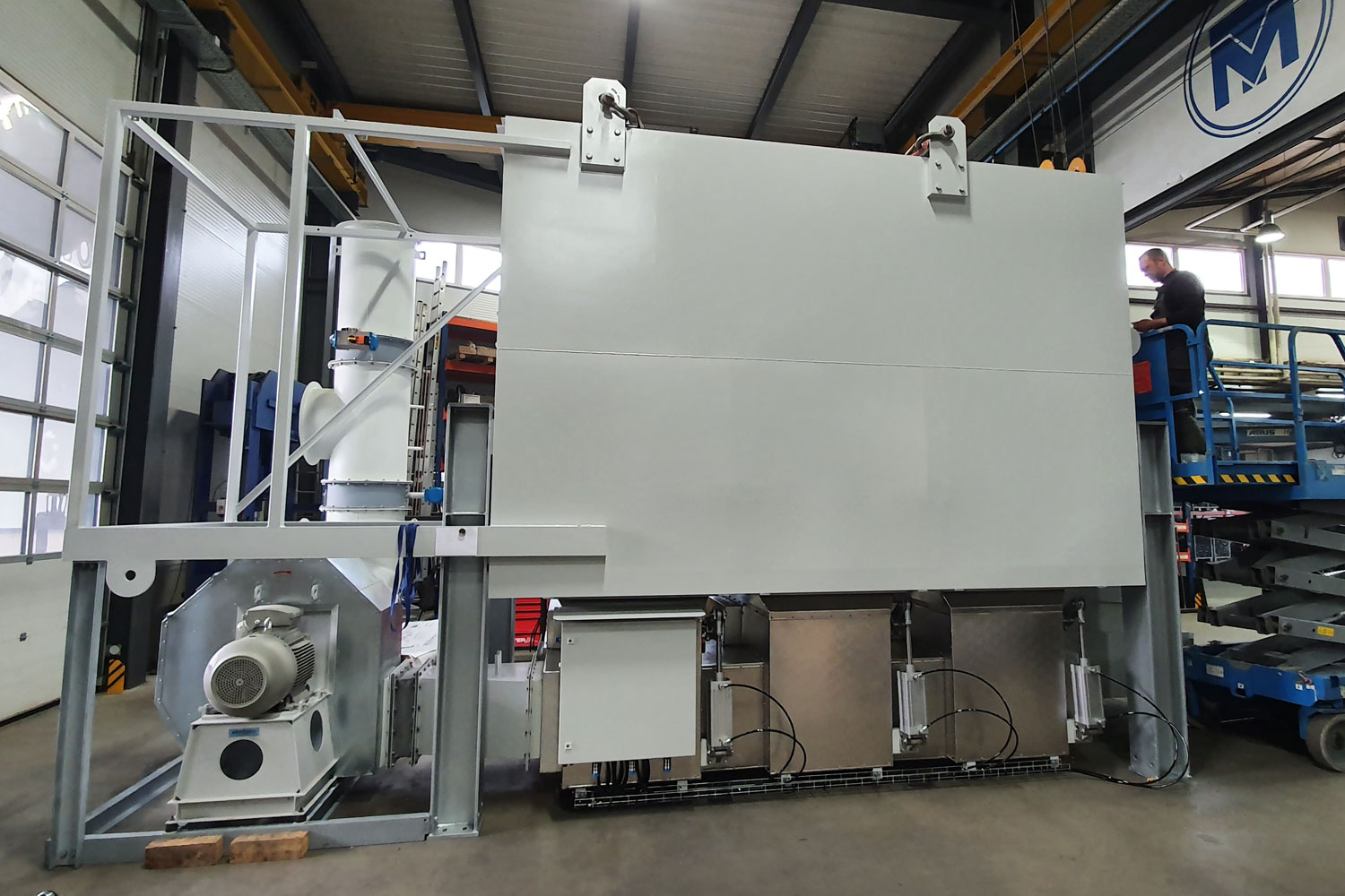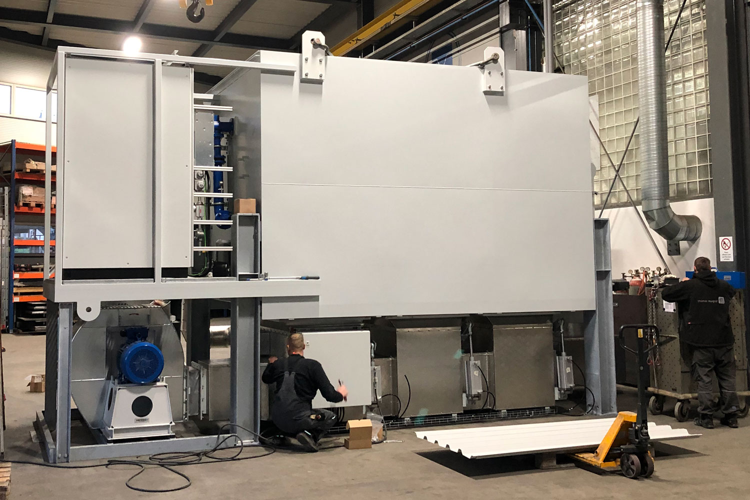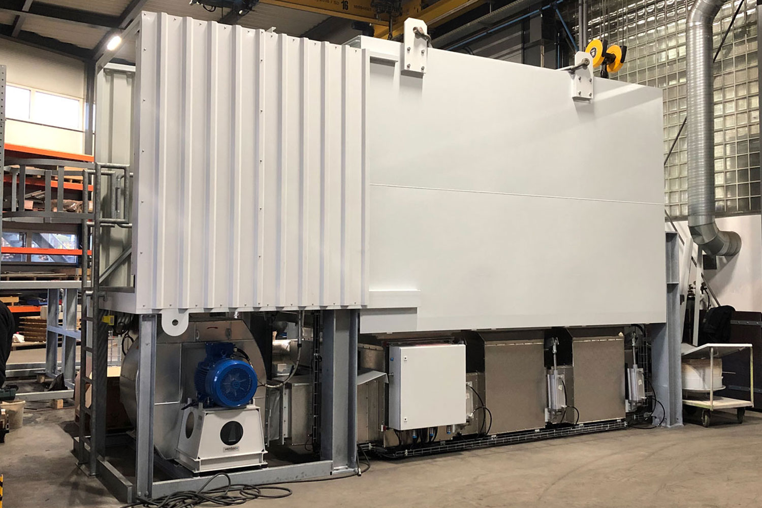 Die Anlage ist transportbedingt in zwei übereinander- stellbaren Einheiten konstruiert und wird zur Abluftreinigung mittels thermisch regenerativer Nachverbrennung in Industrieanlagen eingesetzt.