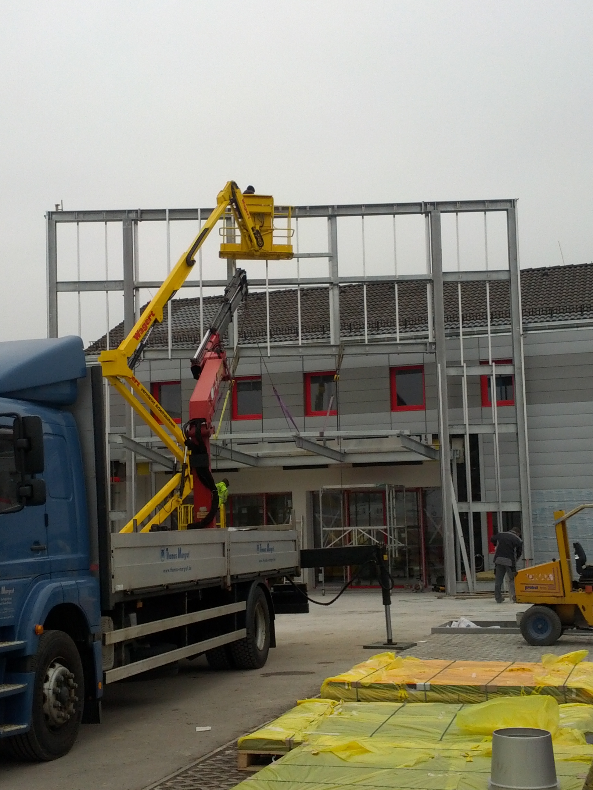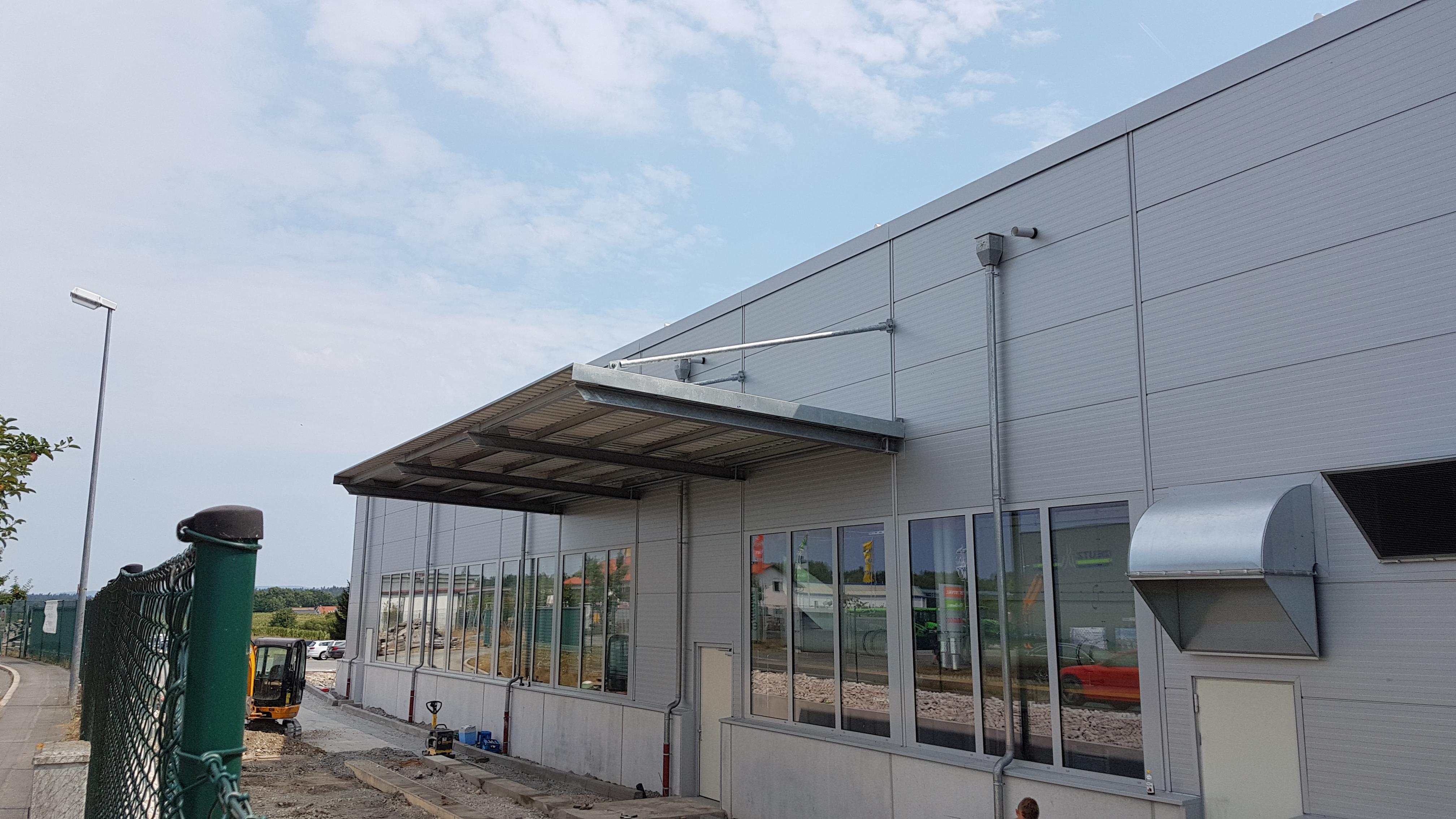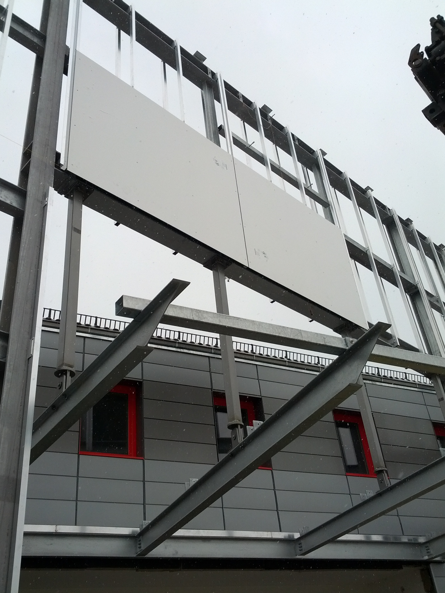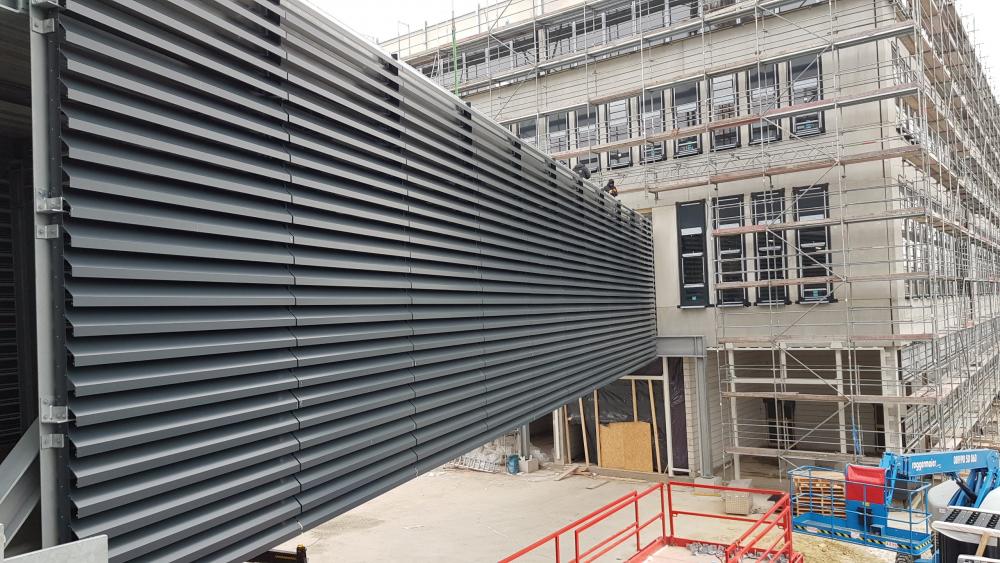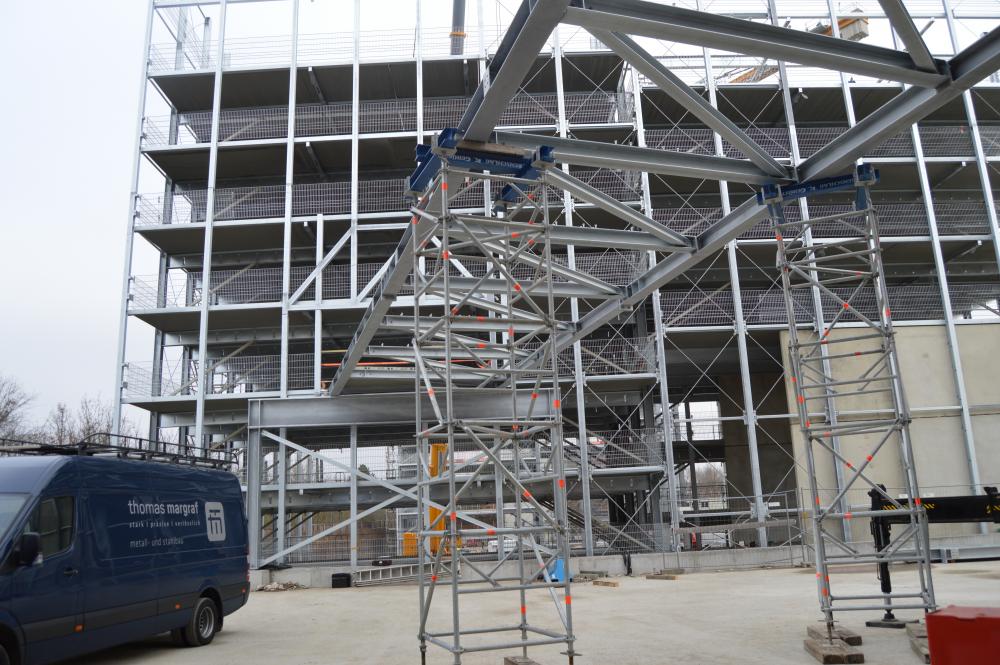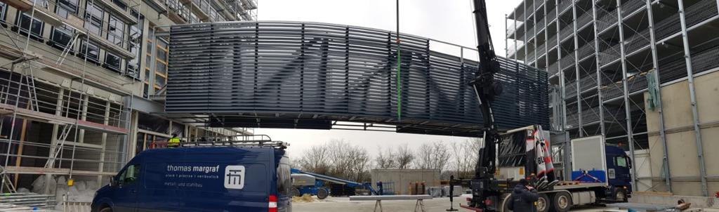 Die Gebäudefassaden wurden von uns mit beschichteten Alu Lamellen zur optischen Aufwertung der Gebäude verkleidet. Die dafür benötigte Stahlunterkonstruktion wurde von uns nach statischen Erfordernissen aus Stahlhohlprofilen gefertigt und montiert.