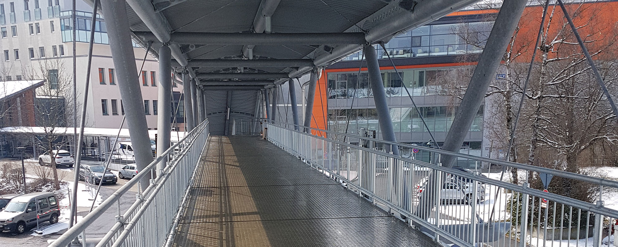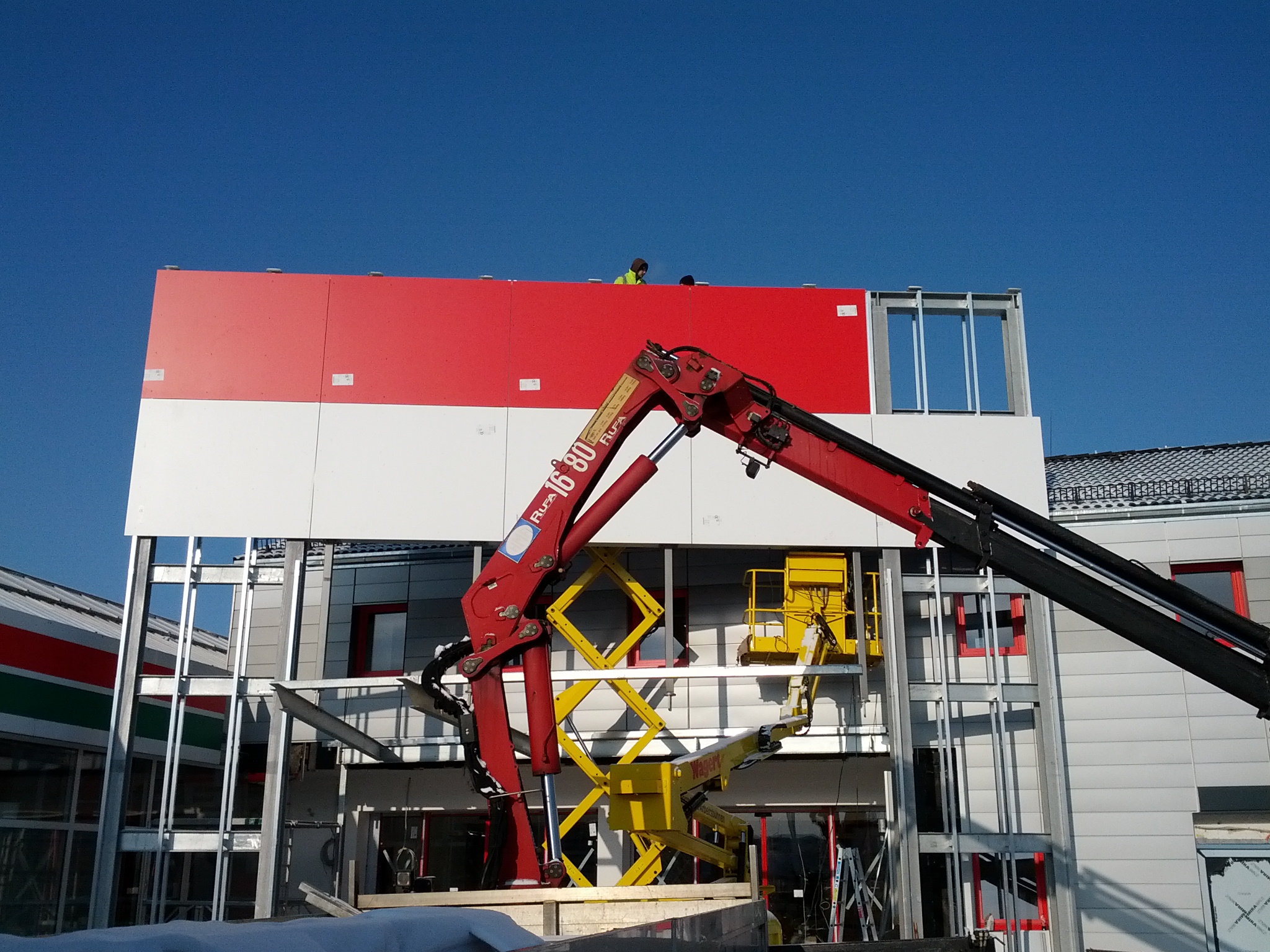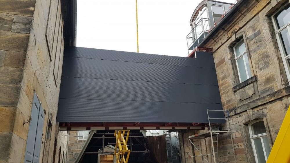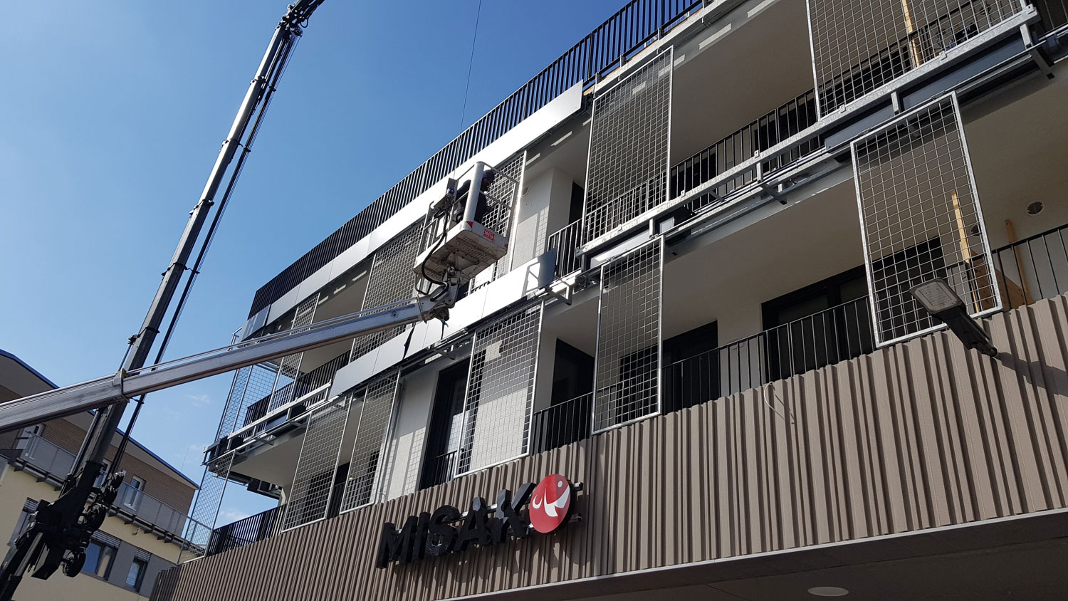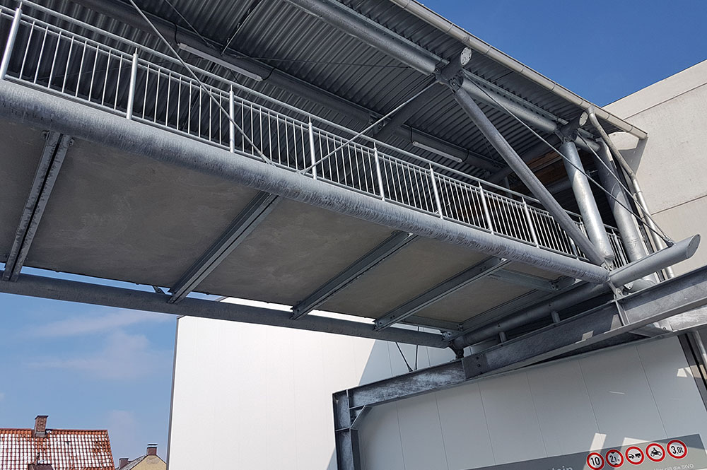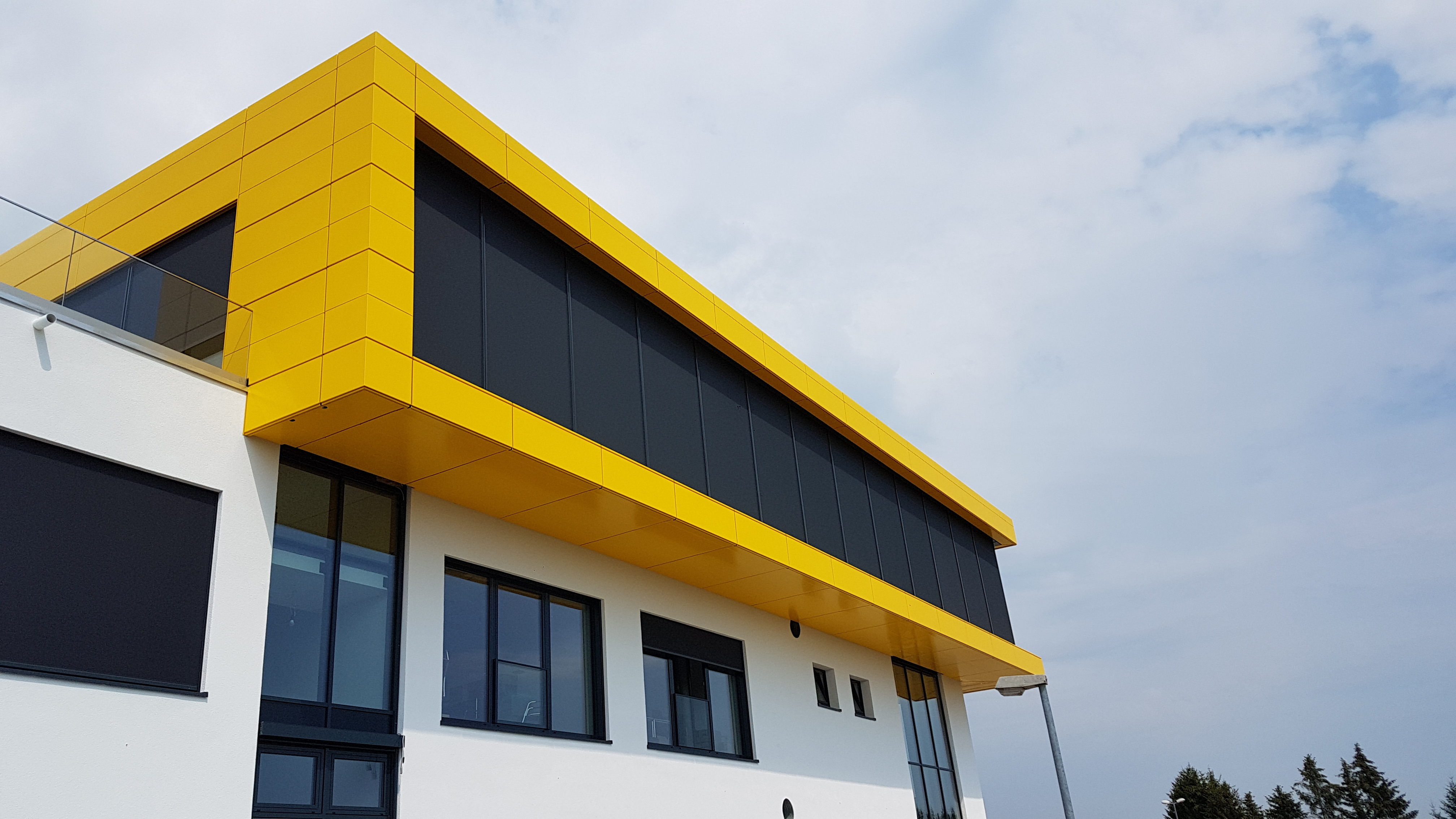 Die Gebäudefassaden wurden von uns mit beschichteten Alu Lamellen zur optischen Aufwertung der Gebäude verkleidet. Die dafür benötigte Stahlunterkonstruktion wurde von uns nach statischen Erfordernissen aus Stahlhohlprofilen gefertigt und montiert.