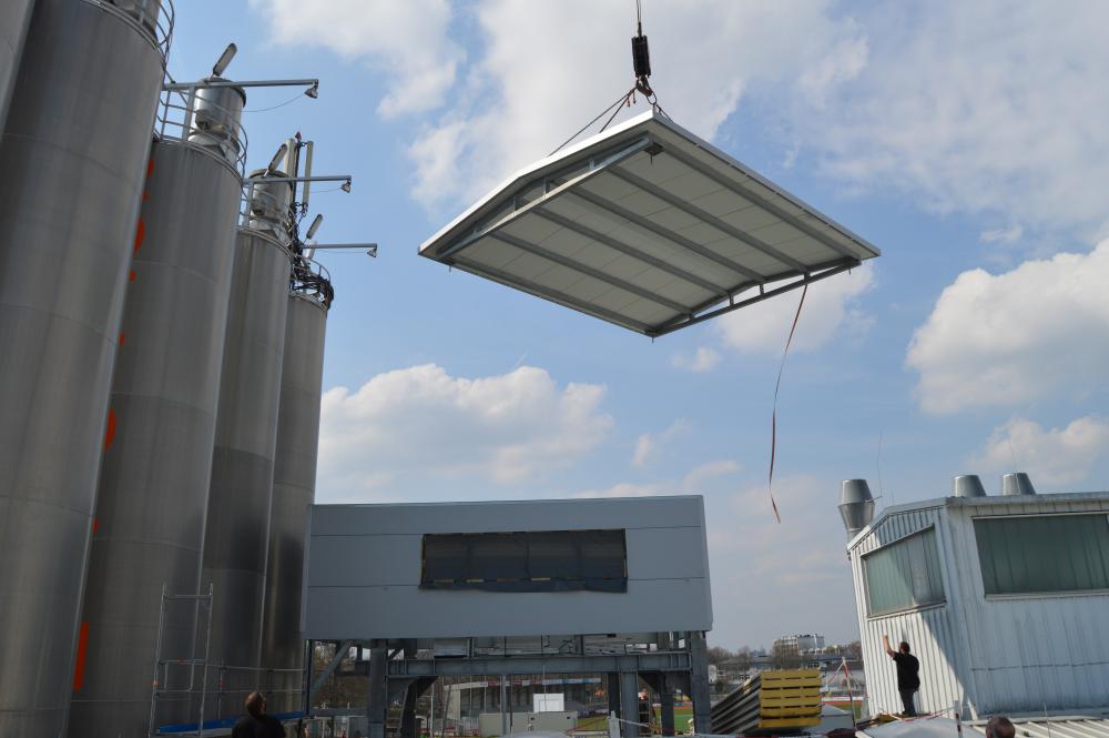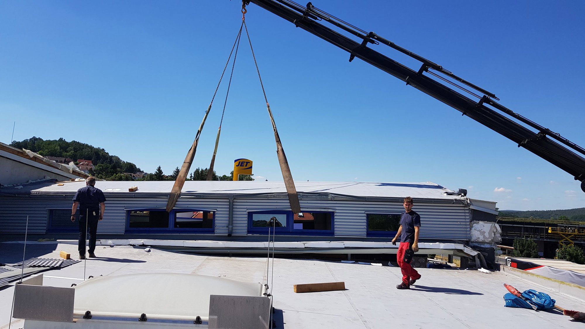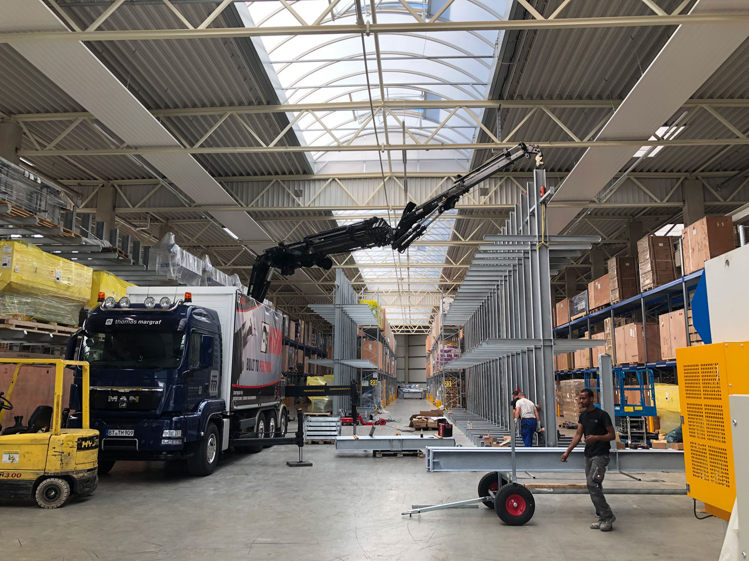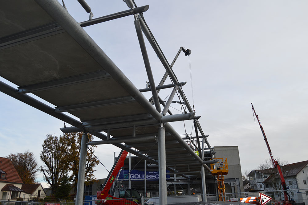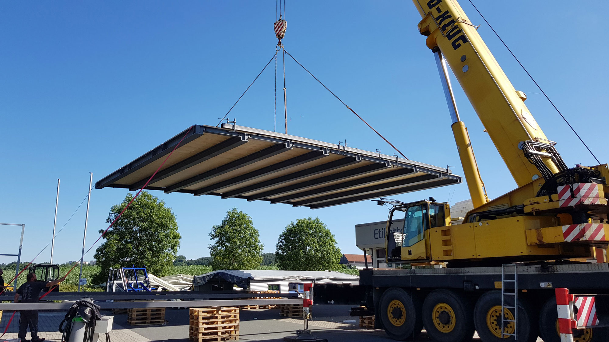 Montage in der Produktionshalle bei laufendem Betrieb über einer bestehenden Anlage sowie Einheben der Überdachkonstruktion mit einem 220t Autokran mit unserem eigenen Montagepersonal.