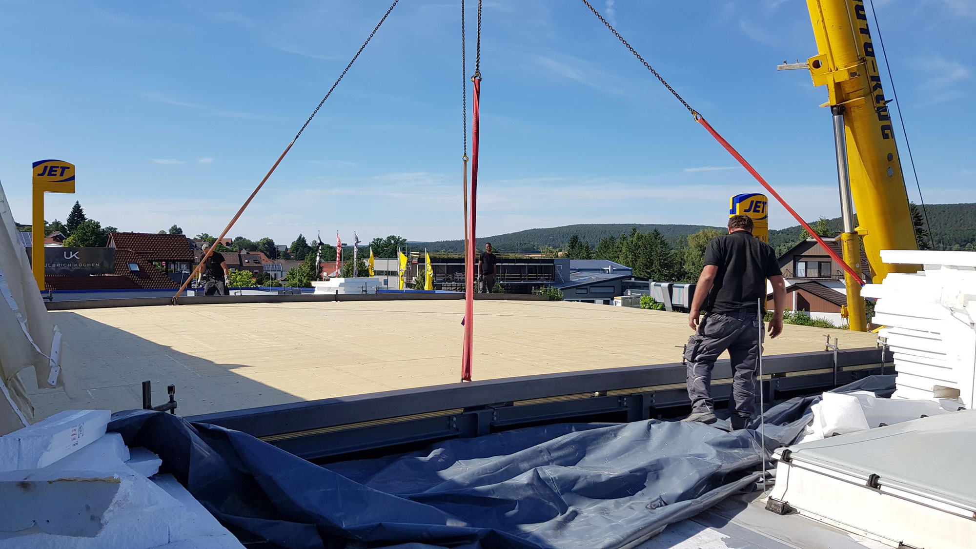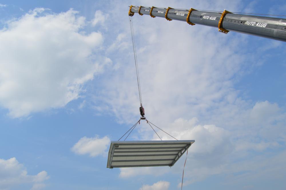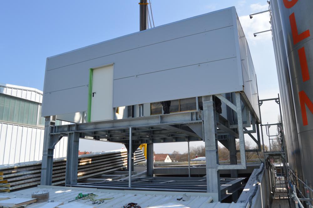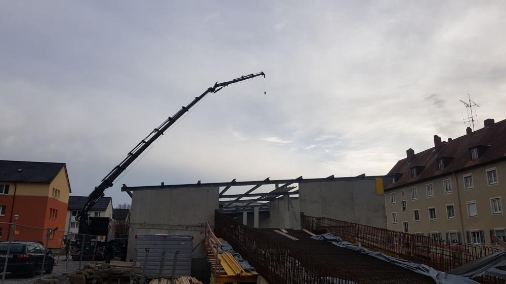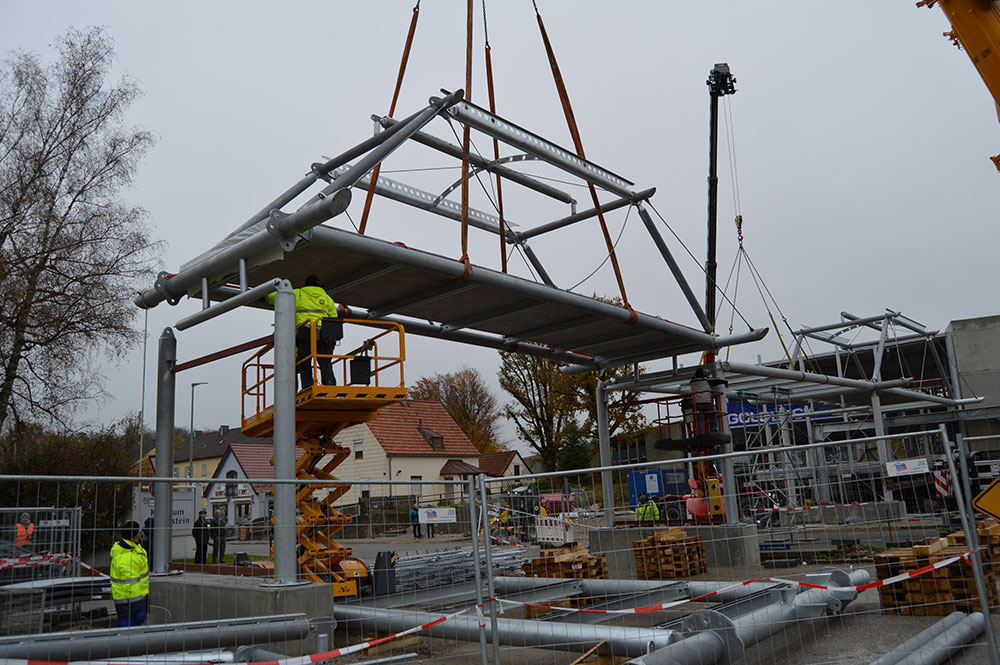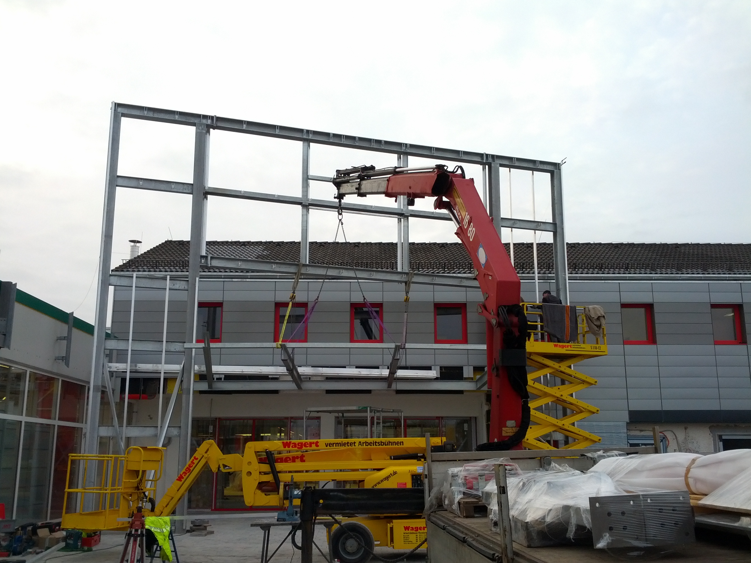 Montage in der Produktionshalle bei laufendem Betrieb über einer bestehenden Anlage sowie Einheben der Überdachkonstruktion mit einem 220t Autokran mit unserem eigenen Montagepersonal.