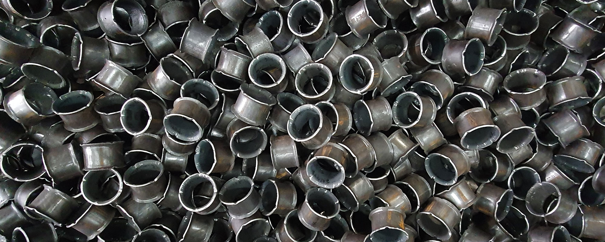 Für eine Bauteillänge der Bördelmuffen von rund 50mm wurden über 50 to. (=13 km) nahtlose Präzisionsstahlrohre DN 50 aus nur einer Produktionscharge bestellt und bei uns eingelagert. Diese werden durch uns automatisiert gesägt und über die Beschickung der Pressmaschine zugeführt. Im Pressvorgang wird der beidseitige Rand des Rohrstücks im vorgegebenen Umfang mit einer Presskraft von 100 to gebördelt und gibt diesem die besondere Stabilität. Durch den automatisierten Produktionsvorgang können die mit dem Kunden vereinbarten Liefertermine gesichert einge- halten werden. Natürlich garantiert unsere im Fertigungs- prozess integrierte Qualitätskontrolle die Einhaltung der hohen Toleranzvorgaben.