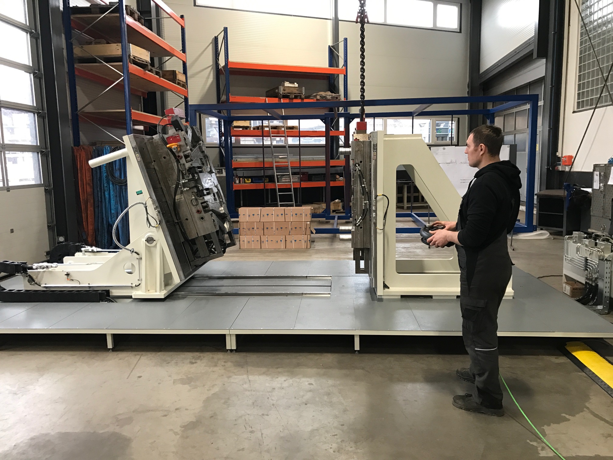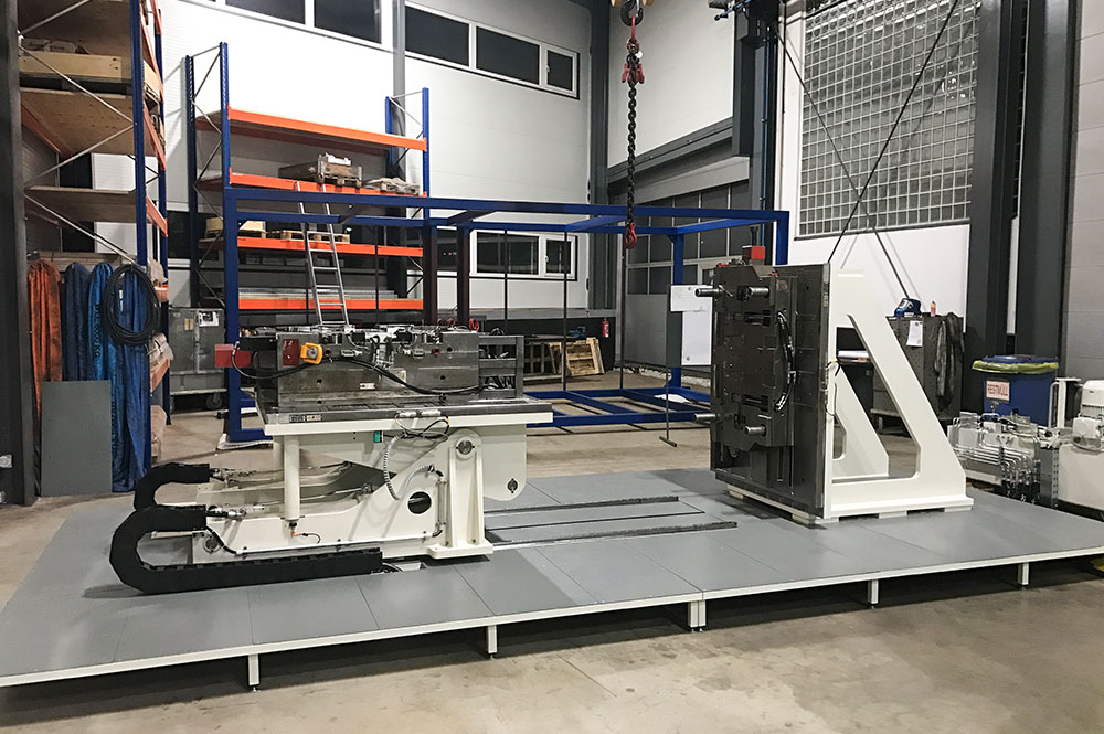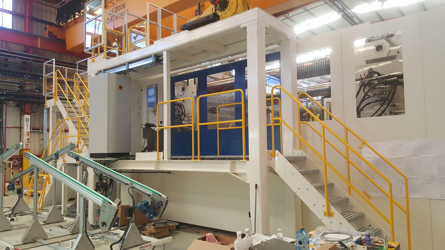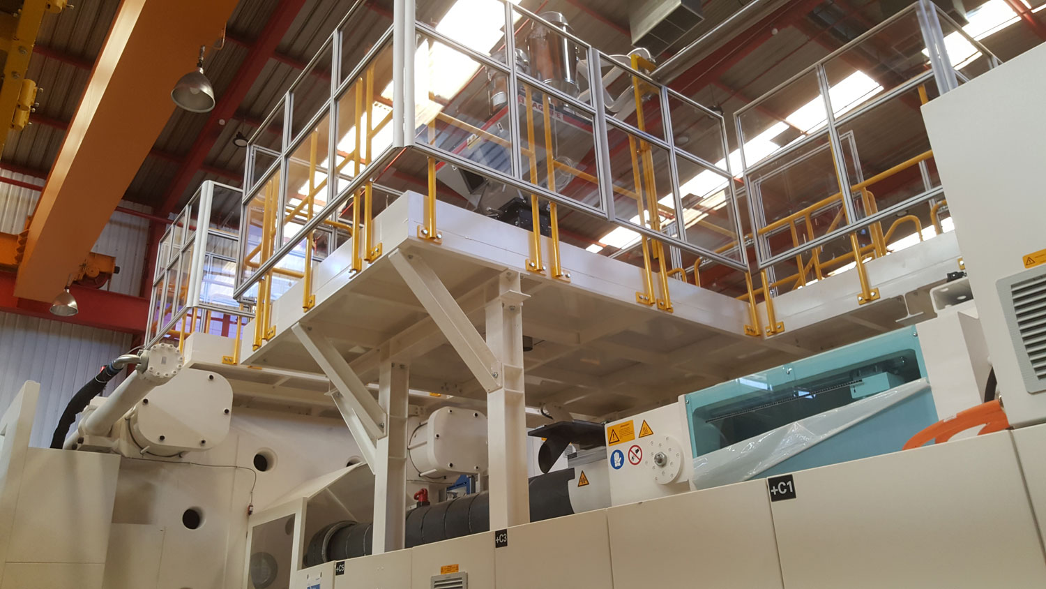 Sie wurde durch unser eigenes Montagepersonal vor Ort beim Endkunden im Westen Spaniens in enger Koordination mit dem kundenseitigen Aufbau der Spritzgußmaschine errichtet. Bei der statischen Auslegung waren u. a. die hohen dynamischen Kräfte des auf 4 Meter Höhe platzierten Handlingroboters zur Entnahme der Spritzgießteile zu berücksichtigen.