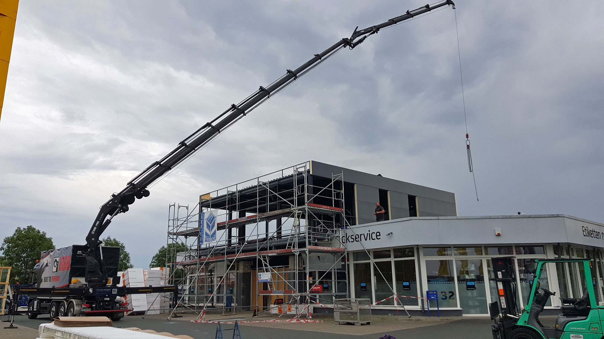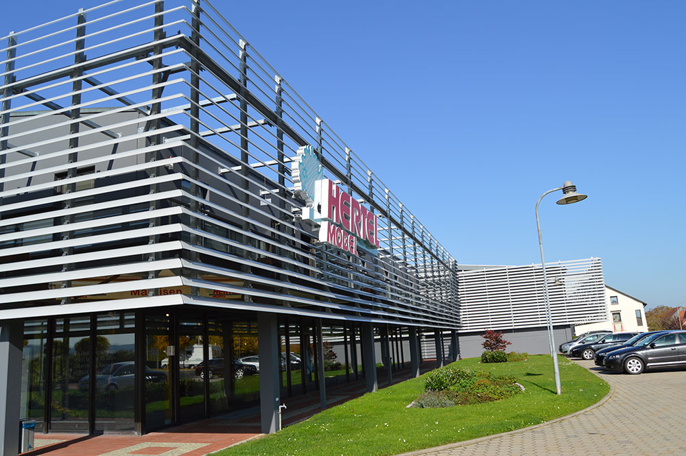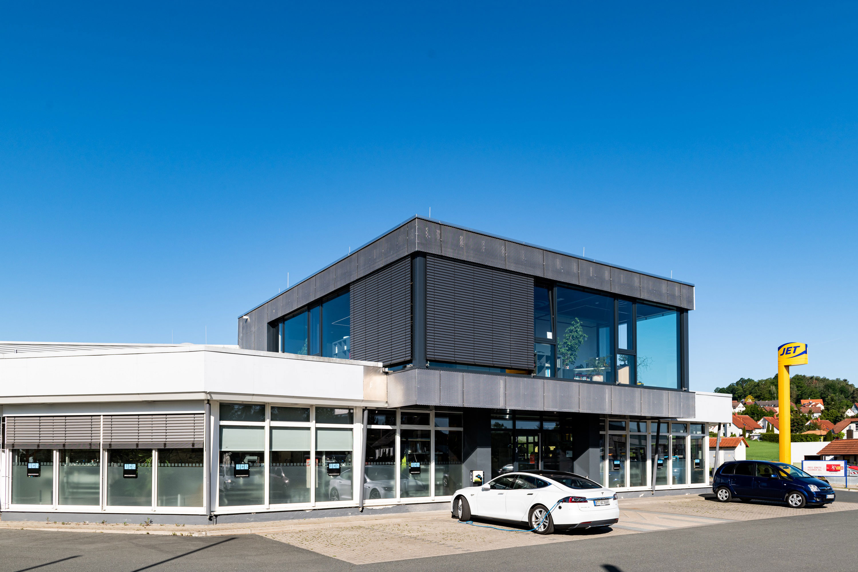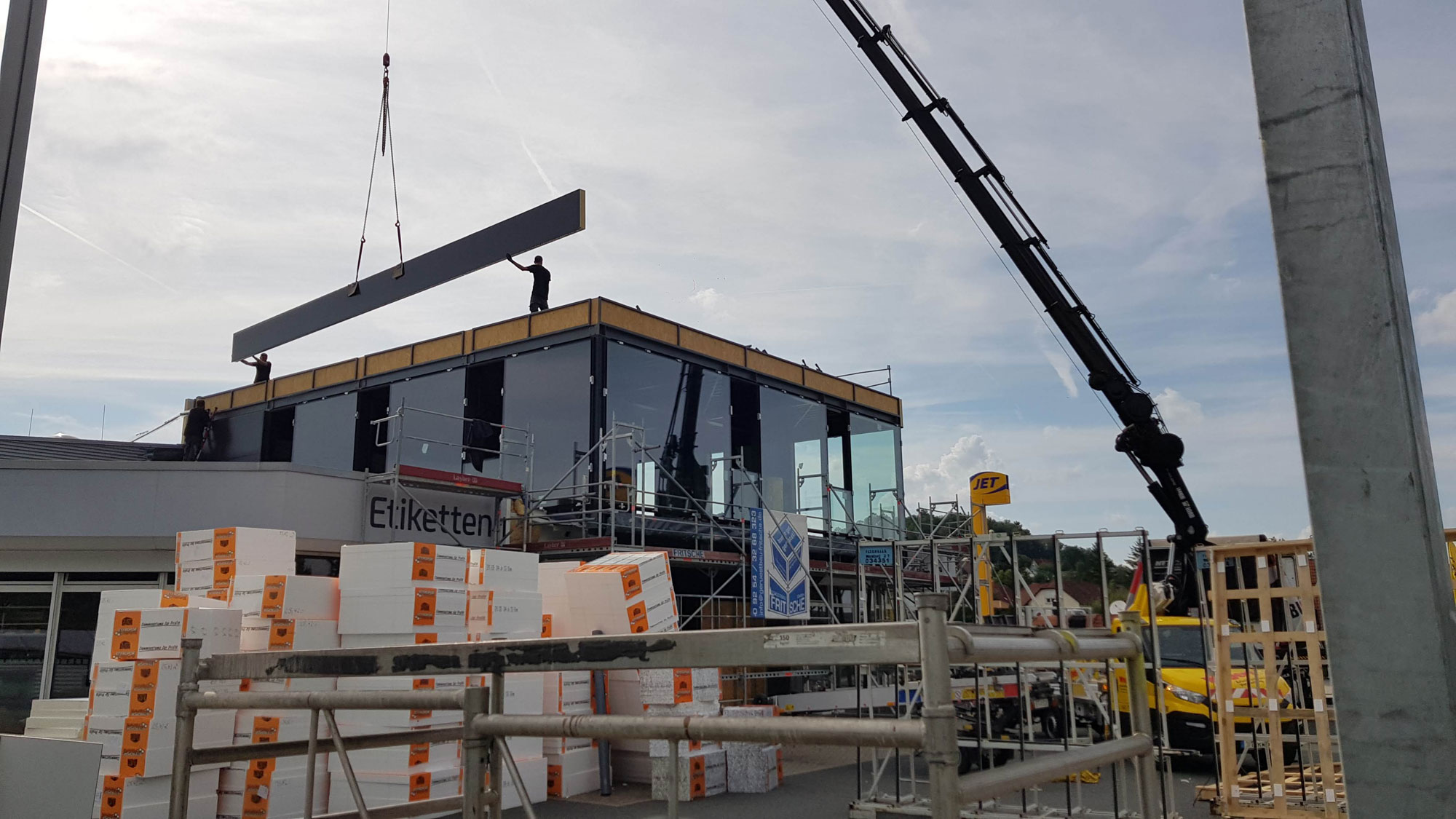Durch einen aufgeständerten Kubus über der bestehenden Verkaufsfläche entstanden für unseren Kunden weitere Büroflächen und außerdem ein werbewirksamer moderner Blickfang an der viel befahrenen Bundesstraße. Große Glasflächen, eine besondere Fassade sowie moderne Innenarchitektur bilden einen architektonischen Hingucker.