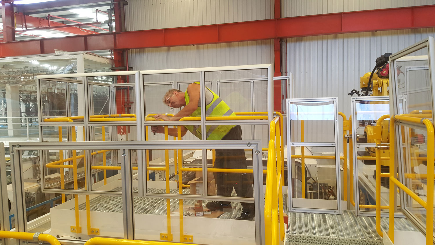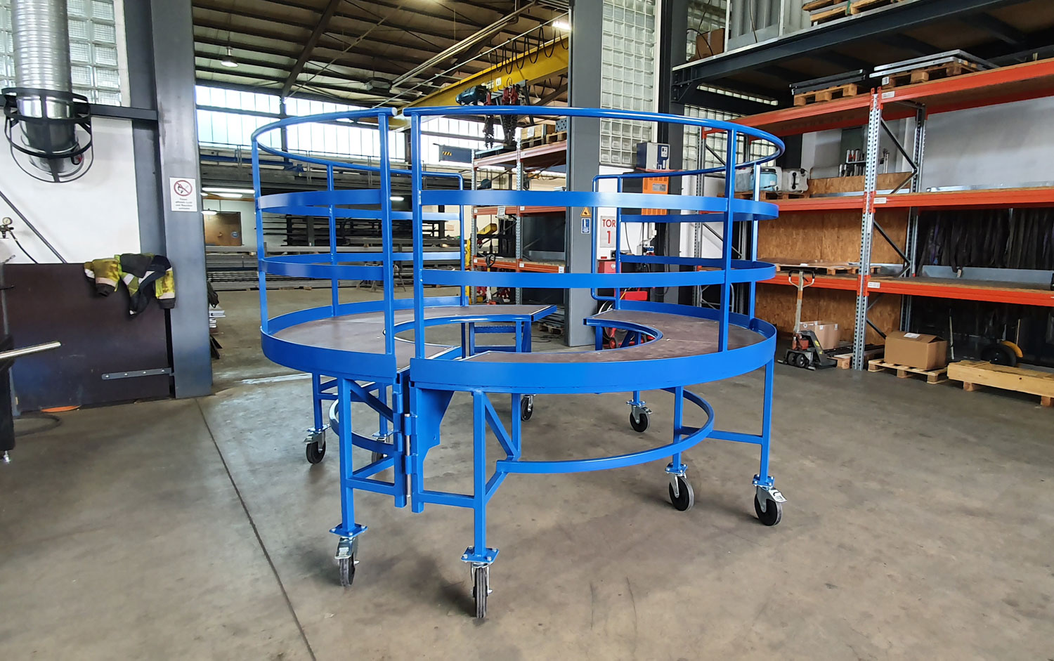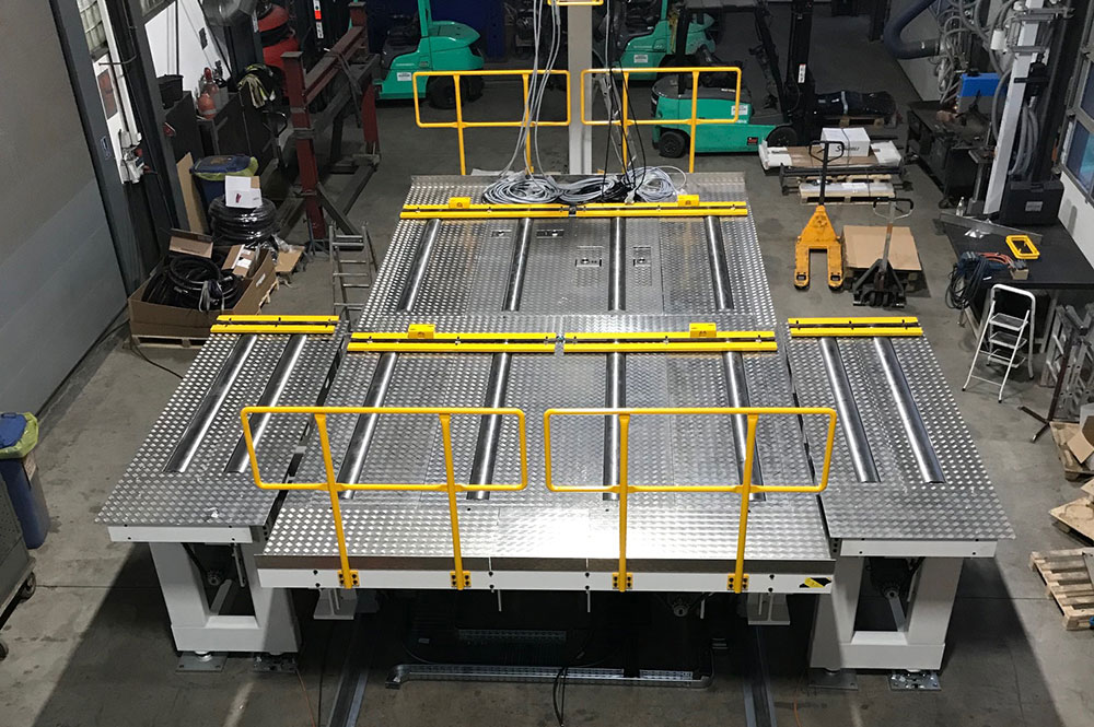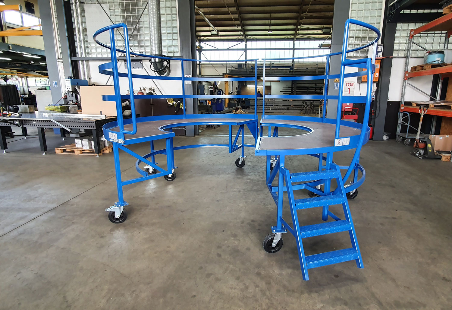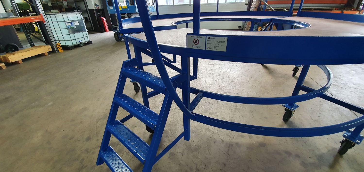 Die Rundbühne kommt im Kunden-Montagewerk zum Einsatz, indem die Bühne um das zu bearbeitende Bauteil herumgefahren und geschlossen wird, um an der Oberseite des Bauteils Montagearbeiten sicher durchführen zu können.