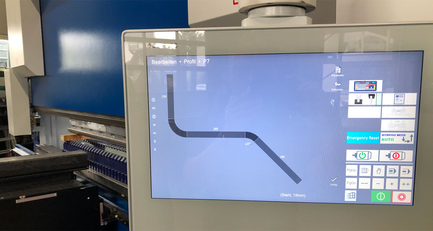 Mit bis zu 400 to Presskraft können wir nun bis zu 4000 mm breite Stahlteile in einem Stück kanten. Durch die Netzwerk- anbindung ist ein einfacher Import von CNC-Auftrags-Programmen möglich. Darüber hinaus bietet die 3D-Touchscreen-Steuerung eine sehr schnelle und äußerst einfache Bedienung wie Anpassung vielfältiger Parameter. Diese Hightech-Maschine dürfte in der Region relativ selten sein und ermöglicht nicht alltägliche Spezialaufträge.